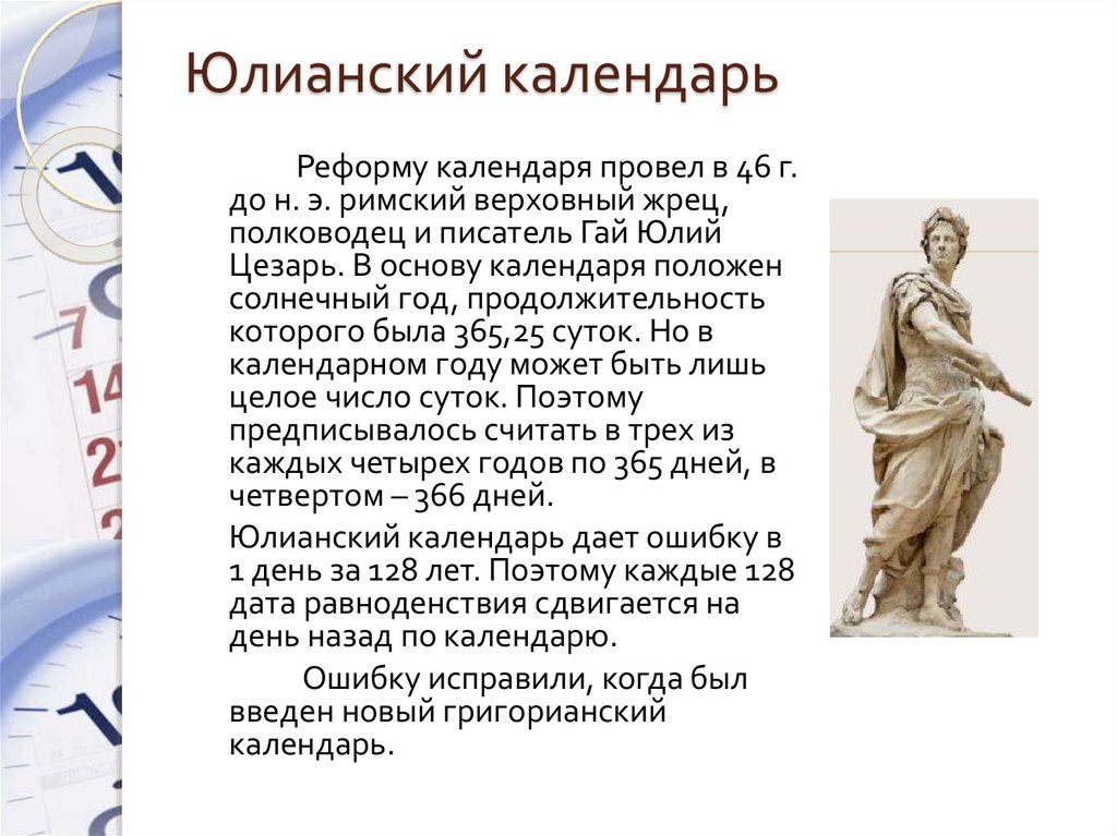 Реформу календаря провел в 46 г.до н. э. римский верховный жрец,
