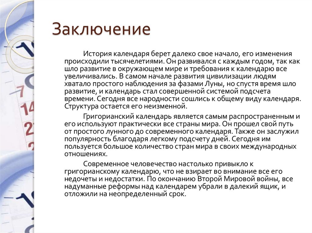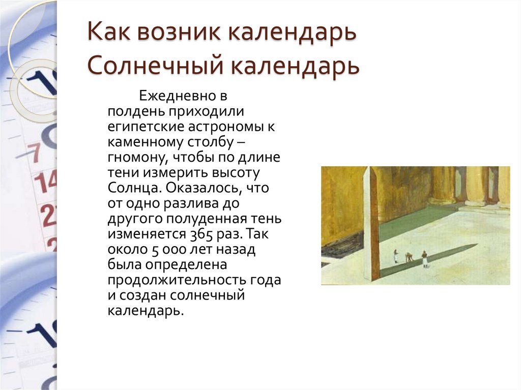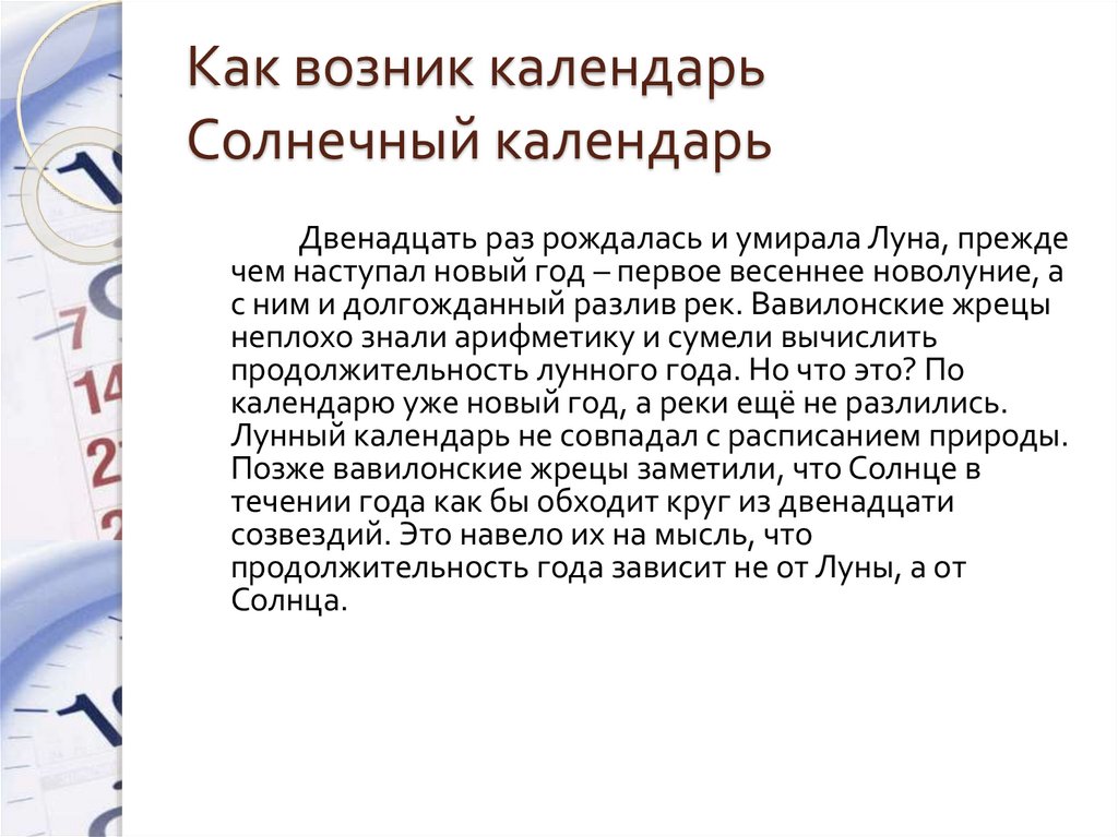 История календаря берет далеко свое начало, его измененияпроисходили тысячелетиями. Он развивался с каждым годом, так как
