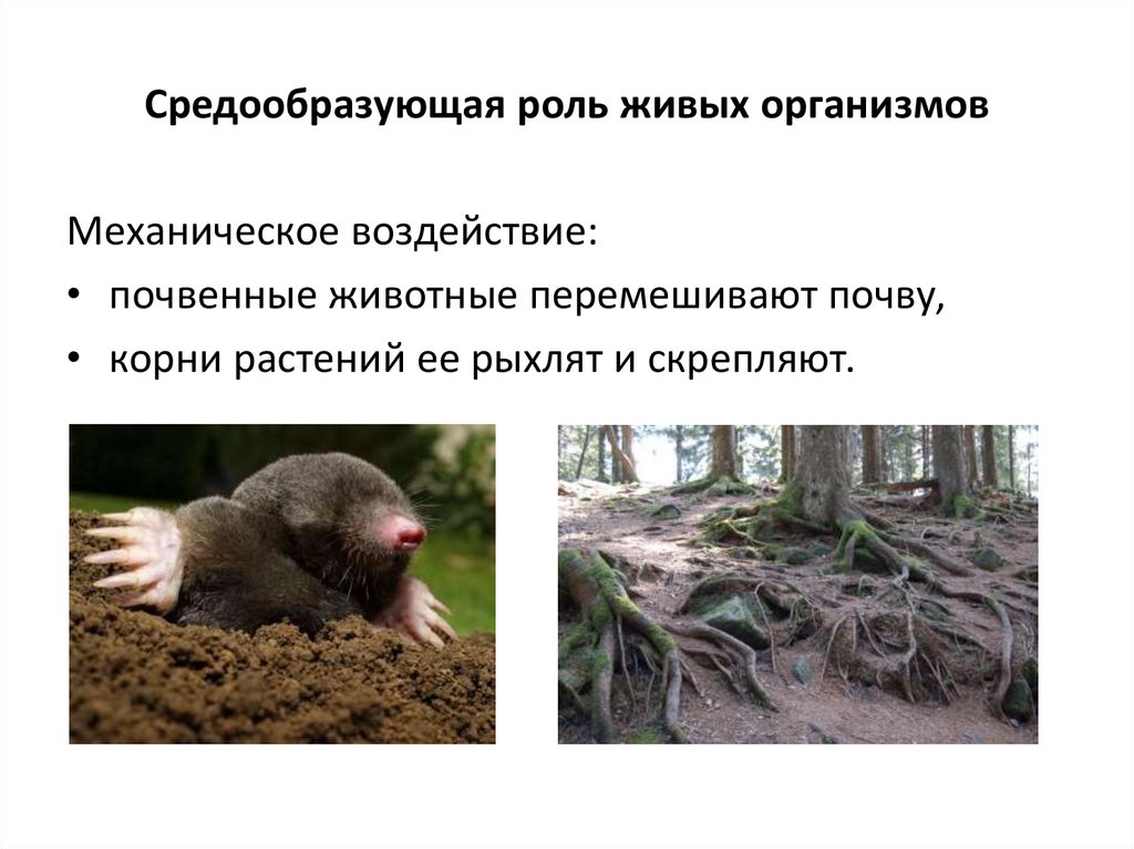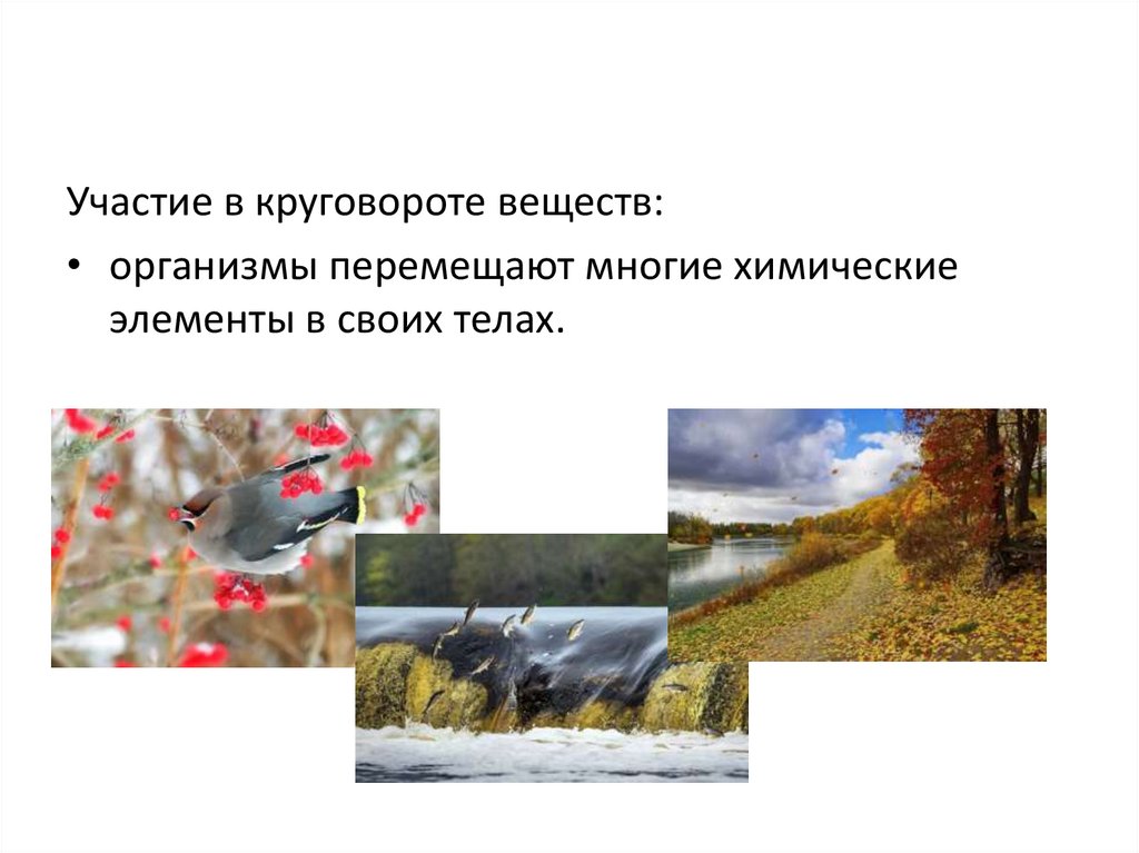 Участие в круговороте веществ:• организмы перемещают многие химические