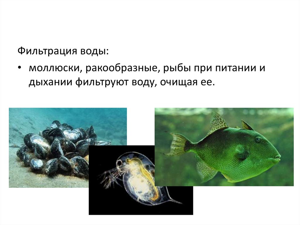 Фильтрация воды:• моллюски, ракообразные, рыбы при питании и