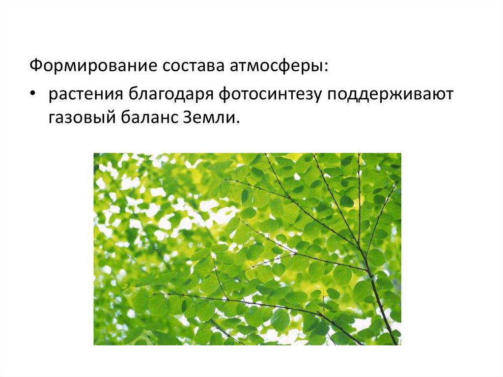 Формирование состава атмосферы:• растения благодаря фотосинтезу поддерживают