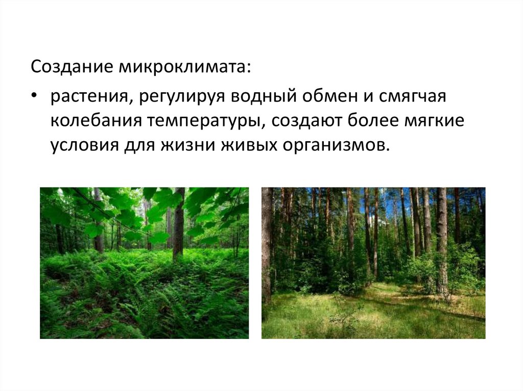 Создание микроклимата:• растения, регулируя водный обмен и смягчая