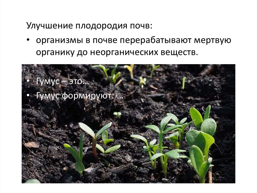 Улучшение плодородия почв:• организмы в почве перерабатывают мертвую