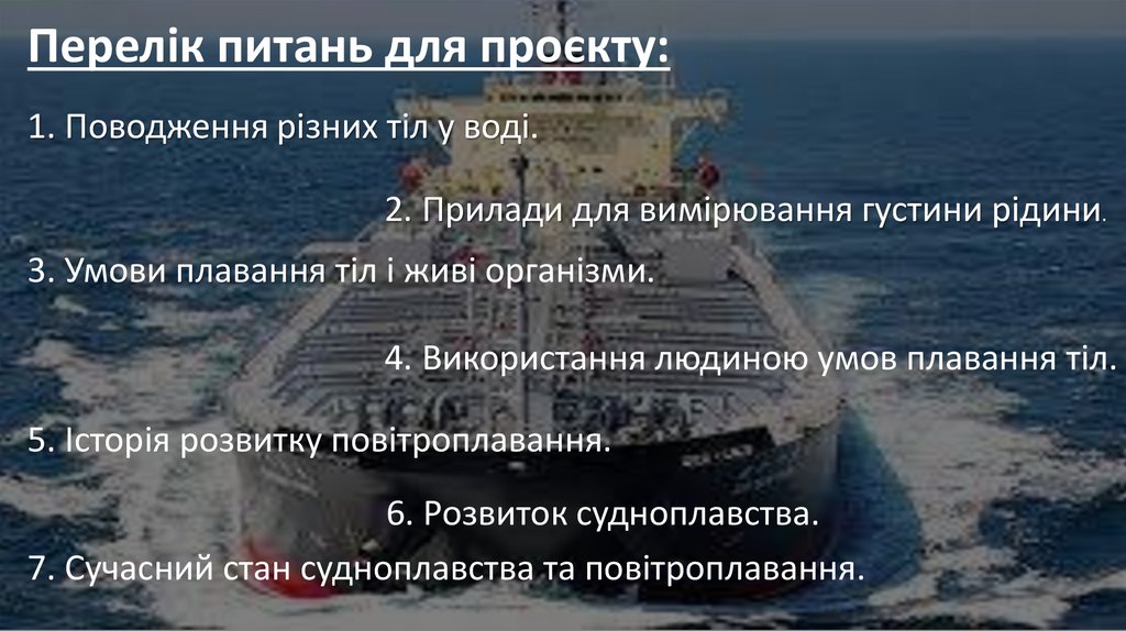 Перелік питань для проєкту:1. Поводження різних тіл у воді.