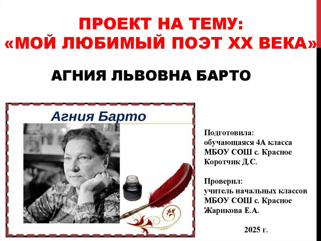 Актуальность исследовательской работы: Данная работа даётвозможность познакомиться с творчеством Агнии Львовны Барто.