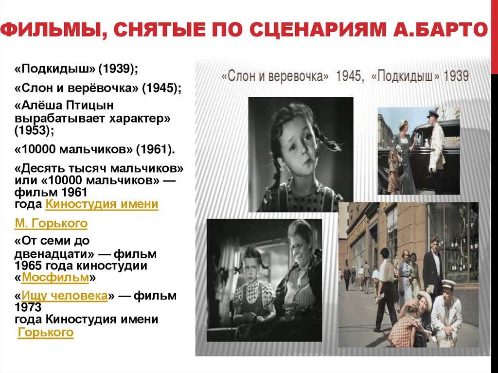 12. ФИЛЬМЫ, СНЯТЫЕ ПО СЦЕНАРИЯМ А.БАРТО