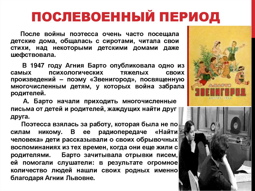 Во время войны Агния Львовна многовыступала по радио, печатала военные
