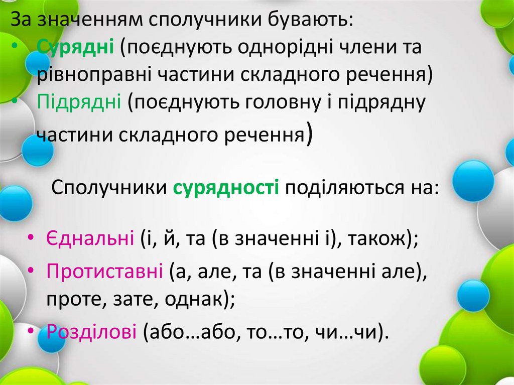 За значенням сполучники бувають:• Сурядні (поєднують однорідні члени та