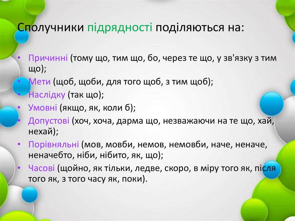 • Причинні (тому що, тим що, бо, через те що, у зв'язку з тимщо);