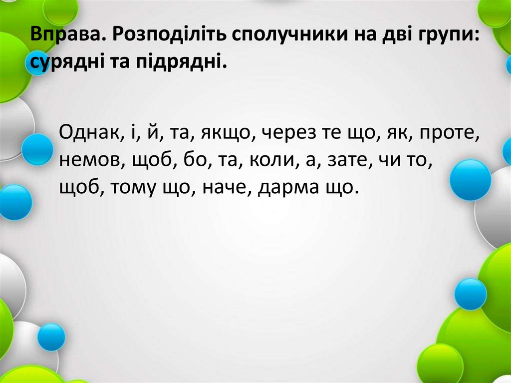5. Вправа. Розподіліть сполучники на дві групи: сурядні та підрядні.