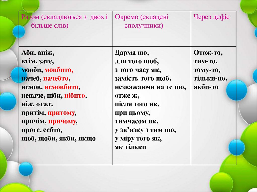так(що), із(за), (мов)би(то), як(би), (про)те,