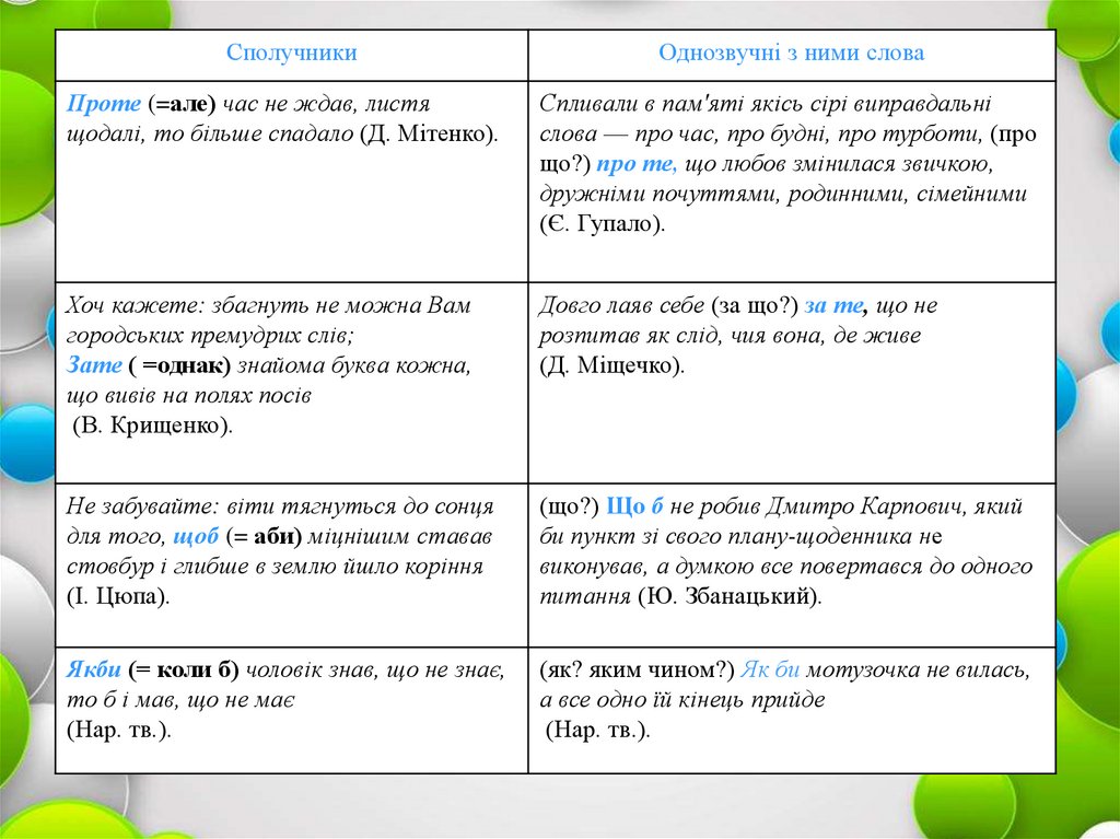 Однак, і, й, та, якщо, через те що, як, проте,немов, щоб, бо, та, коли, а, зате, чи то,