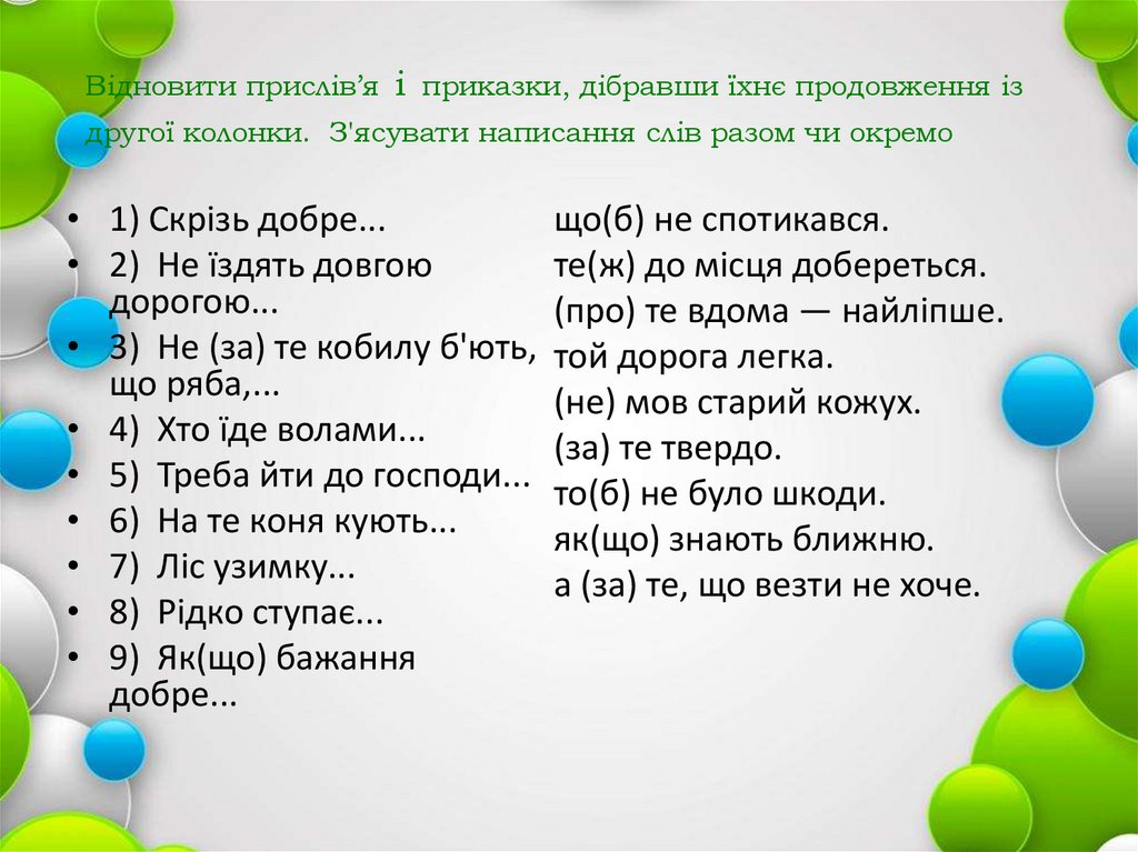 10. Відновити прислів’я і приказки, дібравши їхнє продовження із другої колонки. З'ясувати написання слів разом чи окремо