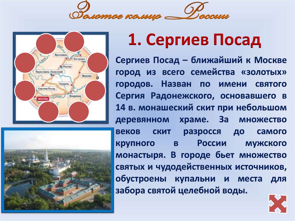 1. Сергиев ПосадСергиев Посад – ближайший к Москве