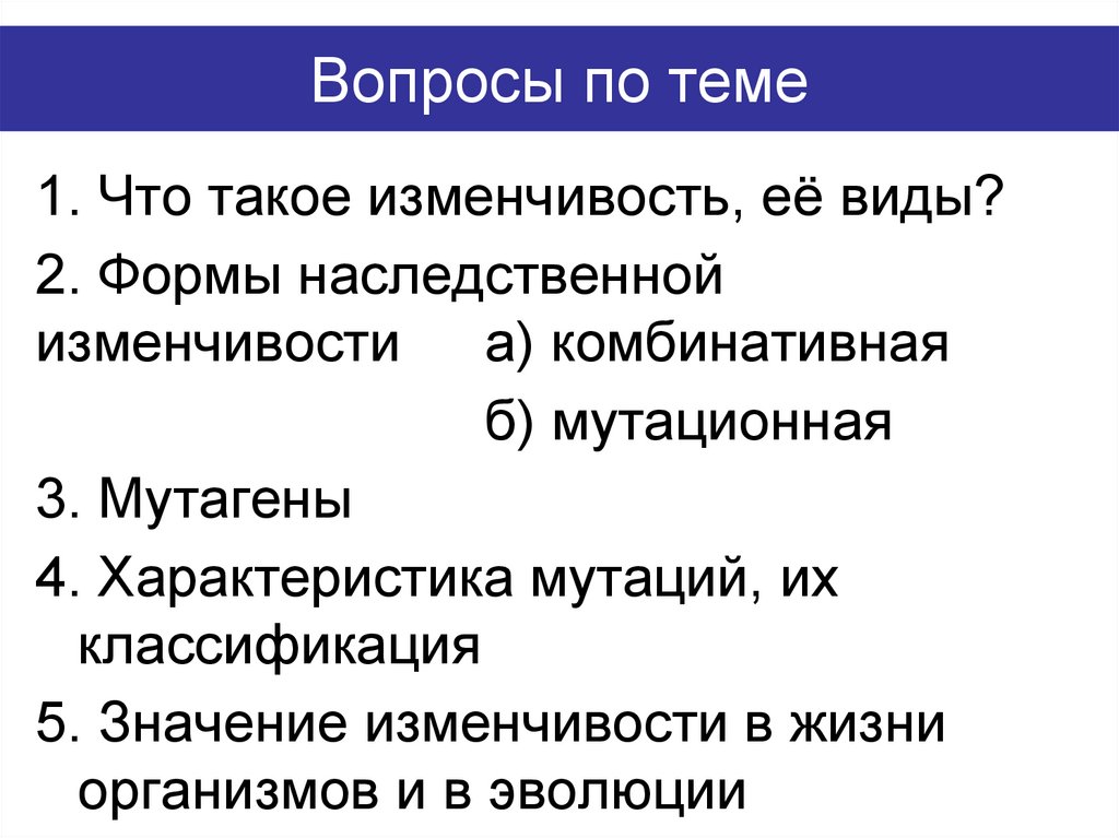 Вопросы по теме1. Что такое изменчивость, её виды?