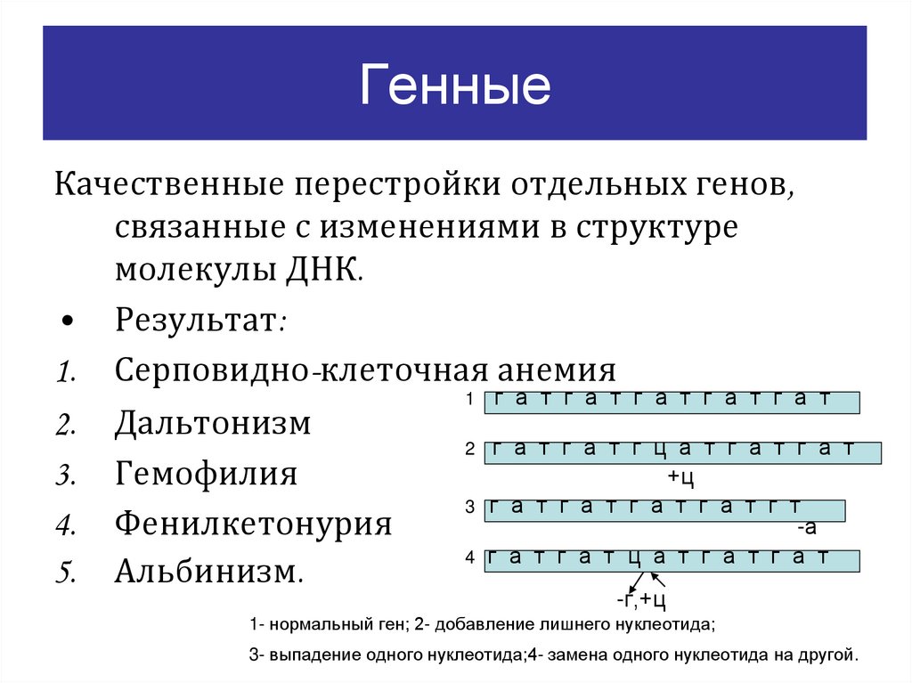 1- нормальный ген; 2- добавление лишнего нуклеотида;