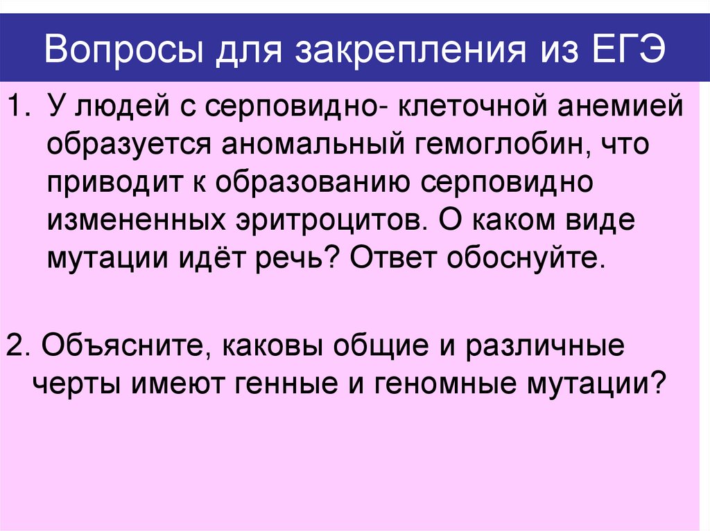 Вопросы для закрепления из ЕГЭ1. У людей с серповидно- клеточной анемией