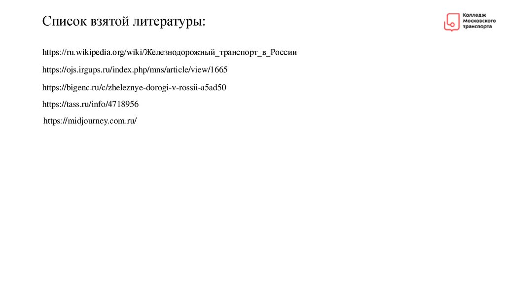 Список взятой литературы:https://ru.wikipedia.org/wiki/Железнодорожный_транспорт_в_России