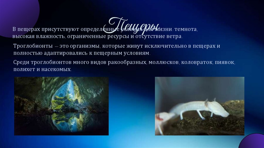 ПещерыВ пещерах присутствуют определенные условия для жизни: темнота,