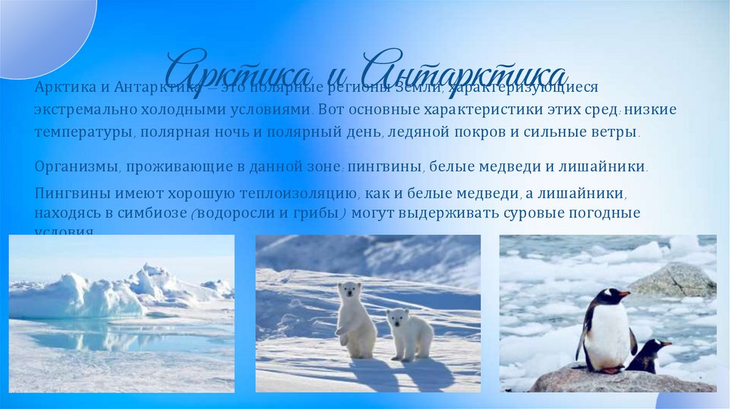 Арктика и АнтарктикаАрктика и Антарктика — это полярные регионы Земли, характеризующиеся