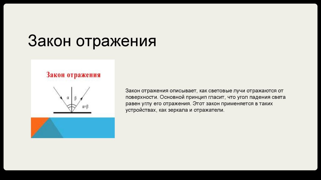 Закон отражения описывает, как световые лучи отражаются отповерхности. Основной принцип гласит, что угол падения света