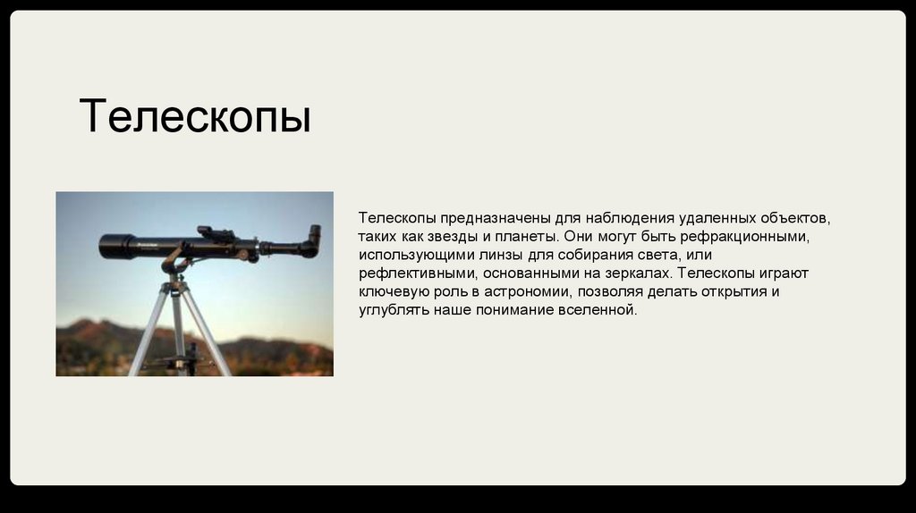 Телескопы предназначены для наблюдения удаленных объектов,таких как звезды и планеты. Они могут быть рефракционными,