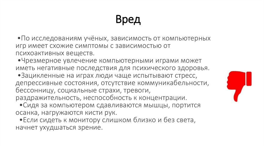 •По исследованиям учёных, зависимость от компьютерныхигр имеет схожие симптомы с зависимостью от