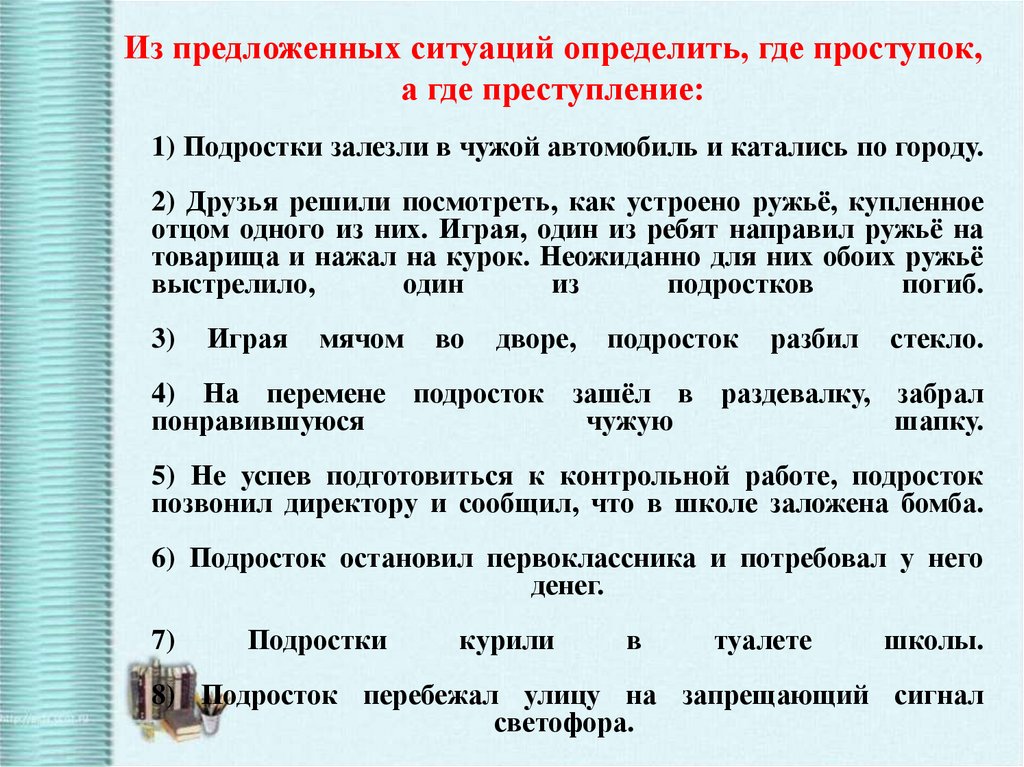 14. Из предложенных ситуаций определить, где проступок, а где преступление: