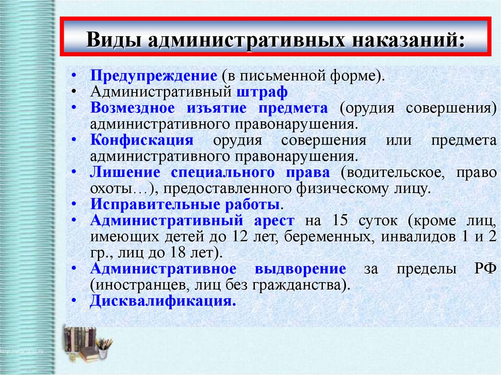 Виды административных наказаний:• Предупреждение (в письменной форме).