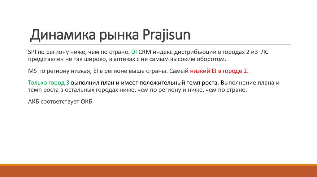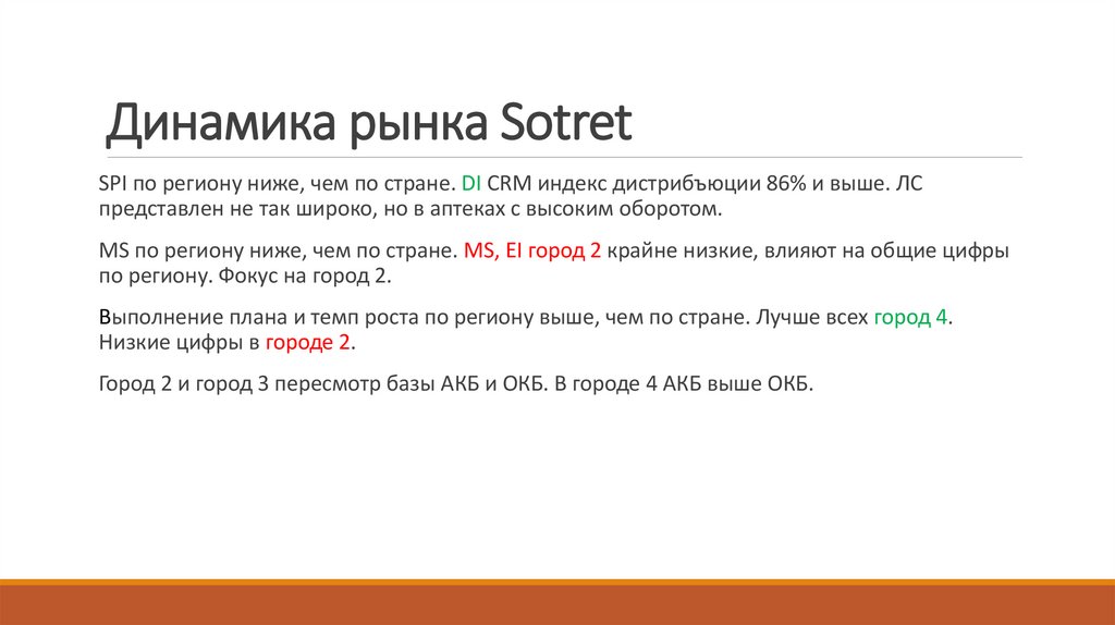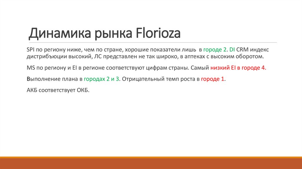 SPI АКБ и ОКБ в фокусных городе 2 и городе 4 выше, чем в регионе и в стране. DI CRMиндекс дистрибъюции выше 93%. ЛС представлен не так широко, но в аптеках с высоким