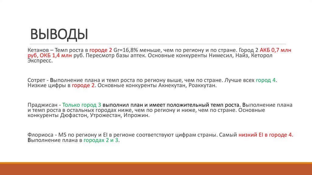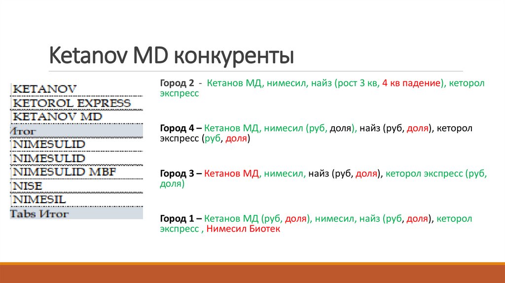Кетанов – Темп роста в городе 2 Gr=16,8% меньше, чем по региону и по стране. Город 2 АКБ 0,7 млнруб, ОКБ 1,4 млн руб. Пересмотр базы аптек. Основные конкуренты Нимесил, Найз, Кеторол Экспресс.
