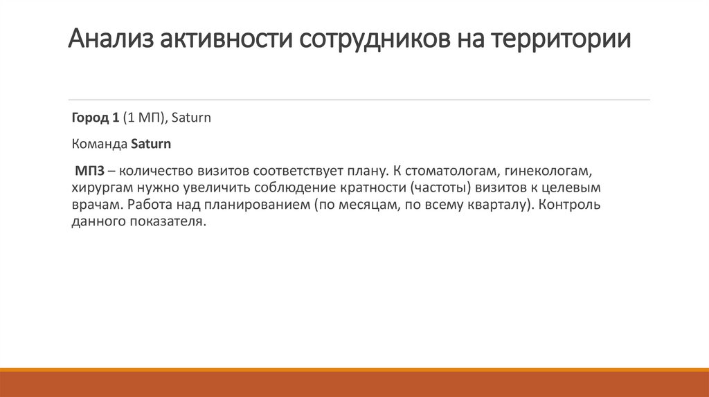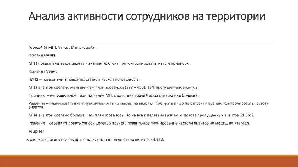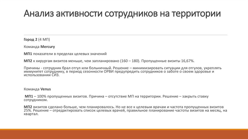 Решение – отредактировать список целевых врачей, правильное планирование частотывизитов на месяц, на квартал. Контроль данного показателя со стороны МП и РМ.