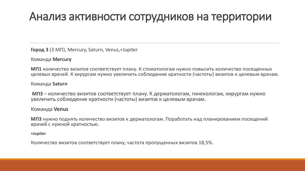 Решение – планировать визитную активность на месяц, на квартал. Собирать инфо по отпускам врачей. Контролировать частоту