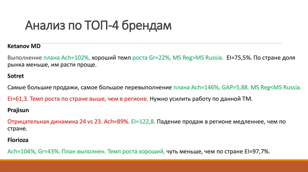 Ketanov MDВыполнение плана Ach=102%, хороший темп роста Gr=22%, MS Reg>MS Russia. EI=75,5%. По стране доля