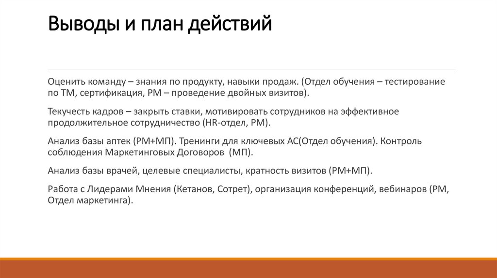 Оценить команду – знания по продукту, навыки продаж. (Отдел обучения – тестированиепо ТМ, сертификация, РМ – проведение двойных визитов).