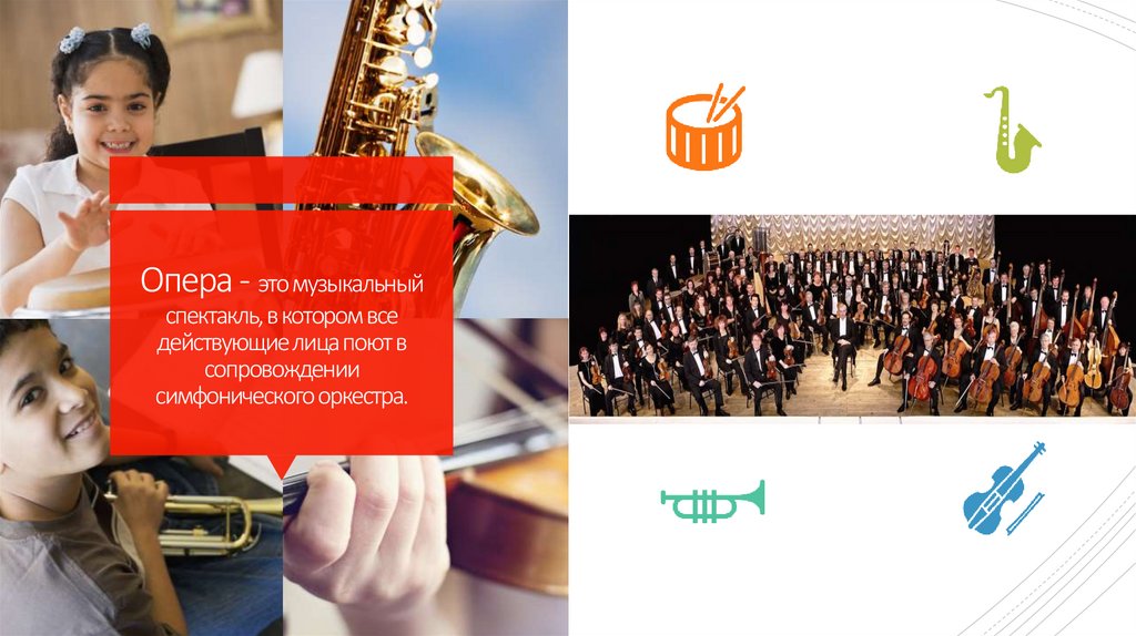 2. Опера - это музыкальный спектакль, в котором все действующие лица поют в сопровождении симфонического оркестра.