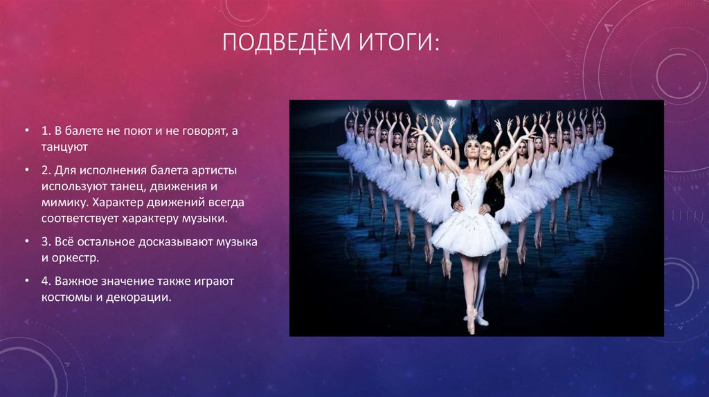 ПОДВЕДЁМ ИТОГИ:• 1. В балете не поют и не говорят, а