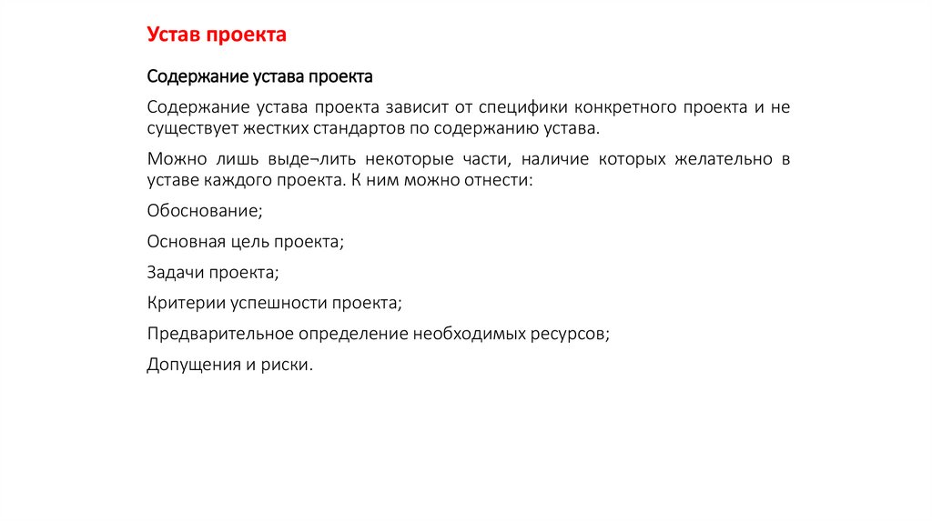 Содержание устава проекта зависит от специфики конкретного проекта и не