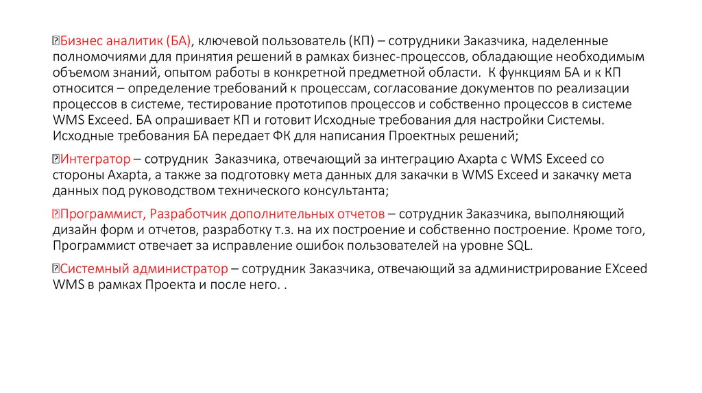 Бизнес аналитик (БА), ключевой пользователь (КП) – сотрудники Заказчика, наделенныеполномочиями для принятия решений в рамках бизнес-процессов, обладающие необходимым