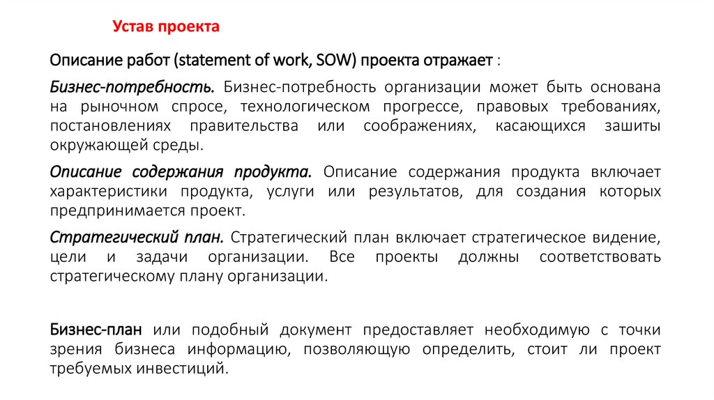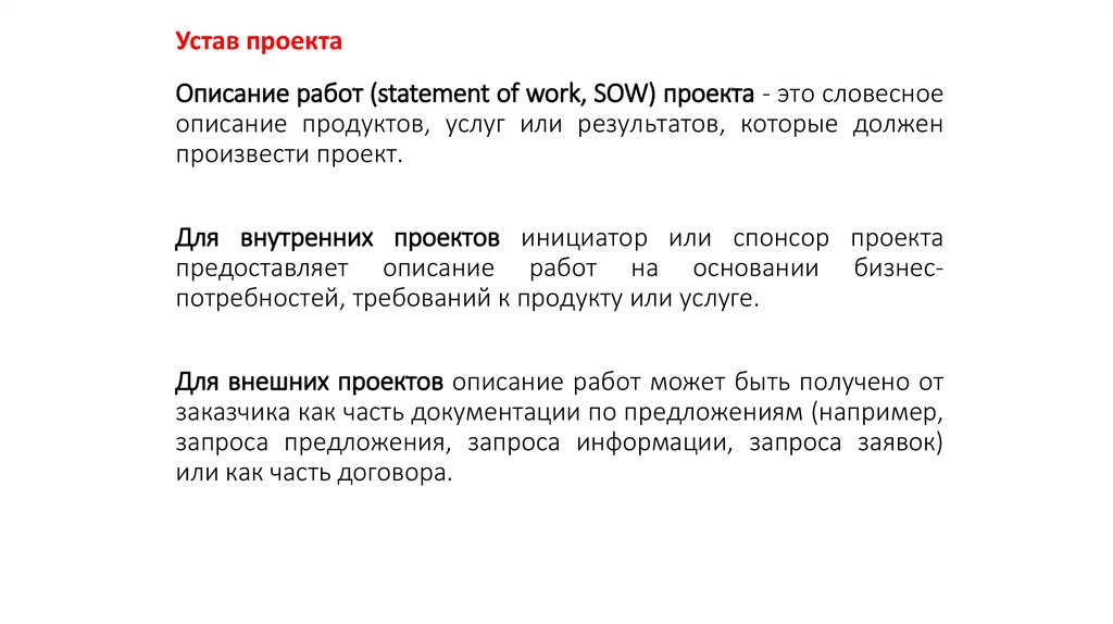 Устав проектаОписание работ (statement of work, SOW) проекта - это словесное