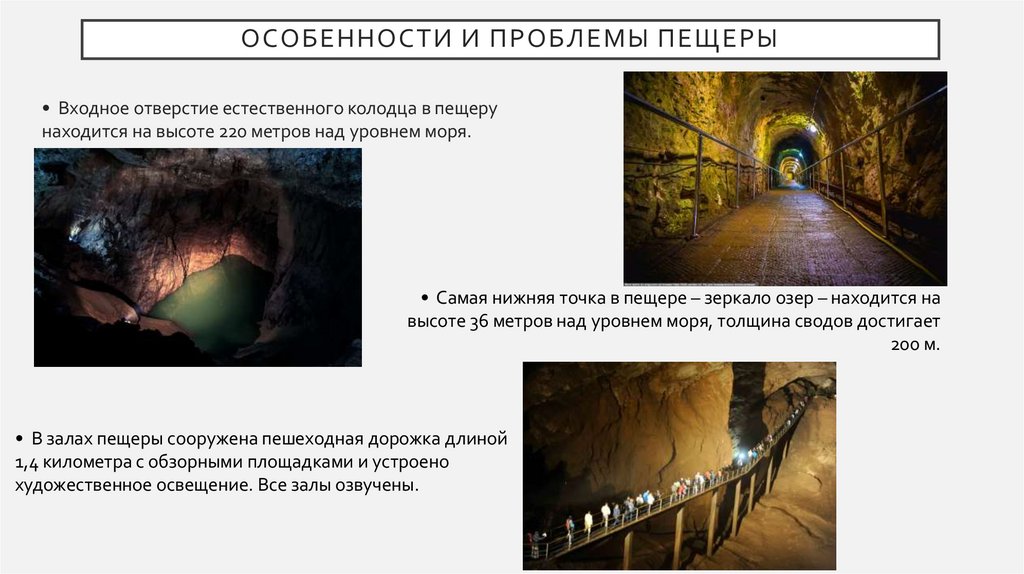 • В залах пещеры сооружена пешеходная дорожка длиной