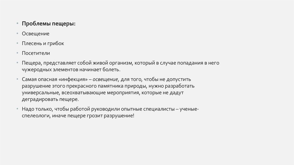 • Надо только, чтобы работой руководили опытные специалисты – ученыеспелеологи, иначе пещере грозит разрушение!