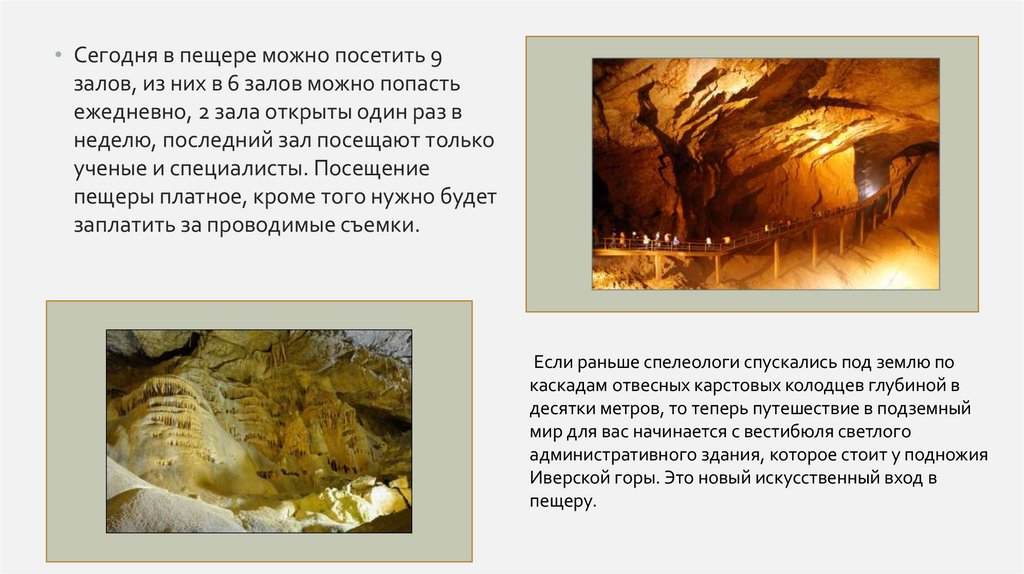 • Сегодня в пещере можно посетить 9залов, из них в 6 залов можно попасть