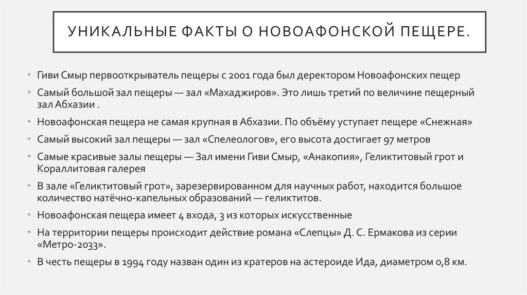 УНИКАЛЬНЫЕ ФАКТЫ О НОВОАФОНСКОЙ ПЕЩЕРЕ.• Гиви Смыр первооткрыватель пещеры с 2001 года был деректором Новоафонских пещер