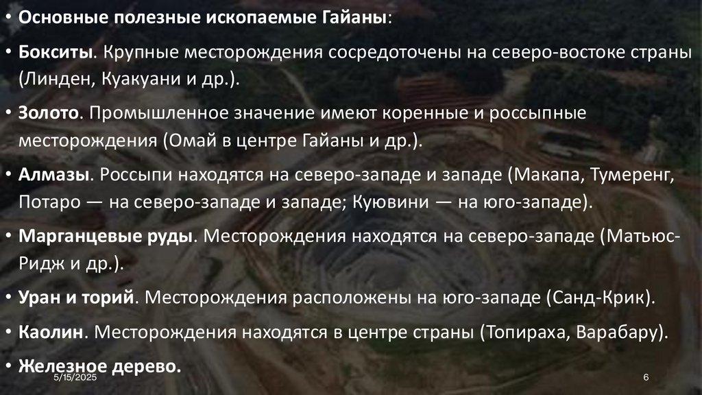 • Основные полезные ископаемые Гайаны:• Бокситы. Крупные месторождения сосредоточены на северо-востоке страны