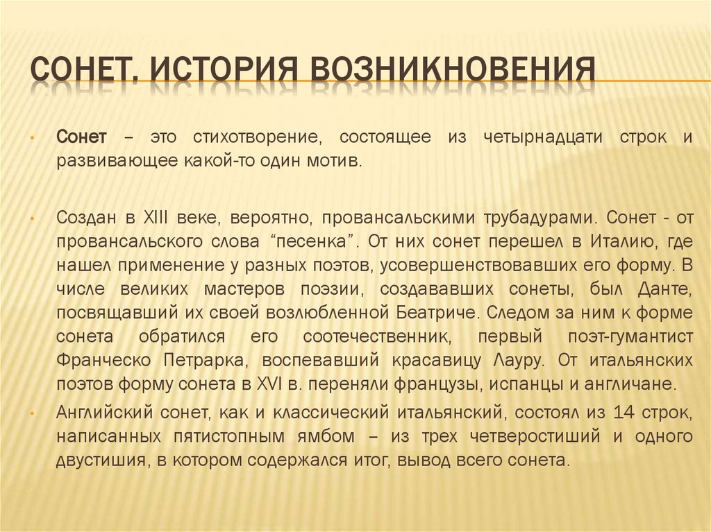СОНЕТ. ИСТОРИЯ ВОЗНИКНОВЕНИЯСонет – это стихотворение, состоящее из четырнадцати строк и