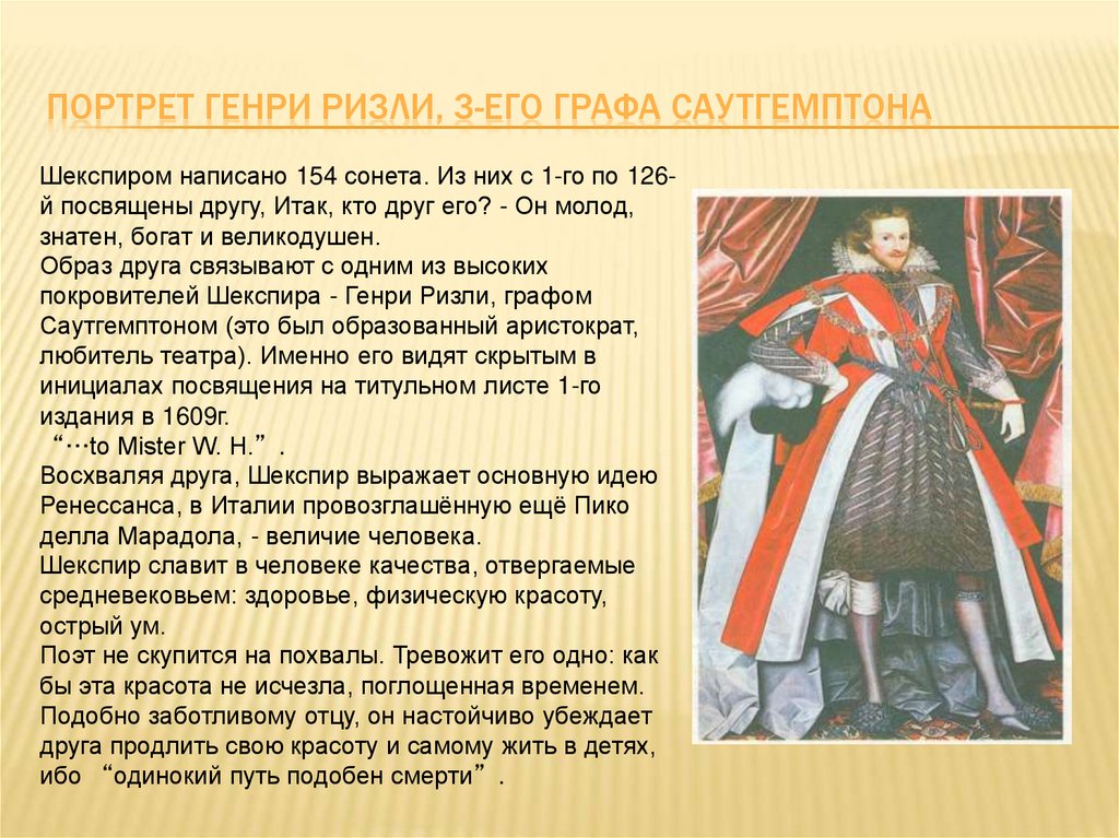 ПОРТРЕТ ГЕНРИ РИЗЛИ, 3-ЕГО ГРАФА САУТГЕМПТОНАШекспиром написано 154 сонета. Из них с 1-го по 126й посвящены другу, Итак, кто друг его? - Он молод,