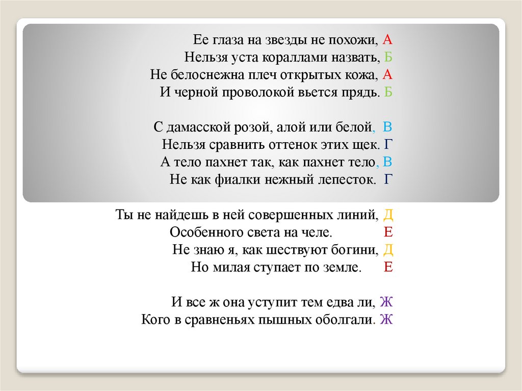7. Ее глаза на звезды не похожи, А Нельзя уста кораллами назвать, Б Не белоснежна плеч открытых кожа, А И черной проволокой вьется
