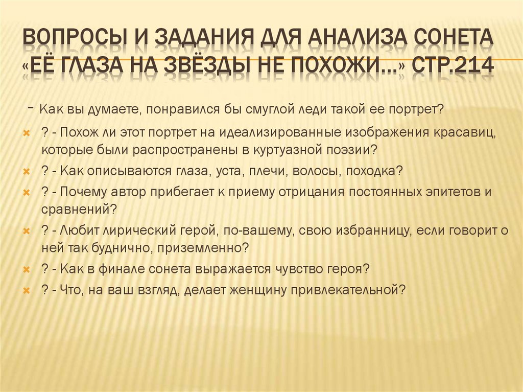 ВОПРОСЫ И ЗАДАНИЯ ДЛЯ АНАЛИЗА СОНЕТА«ЕЁ ГЛАЗА НА ЗВЁЗДЫ НЕ ПОХОЖИ…» СТР.214