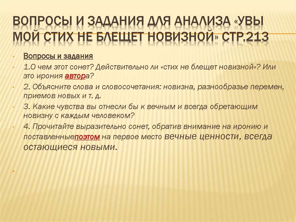 ВОПРОСЫ И ЗАДАНИЯ ДЛЯ АНАЛИЗА «УВЫМОЙ СТИХ НЕ БЛЕЩЕТ НОВИЗНОЙ» СТР.213